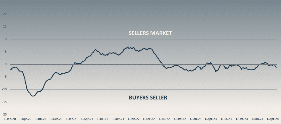 The market remains in the neutral zone, however rather than continuing last month's trend towards favoring sellers, we have seen a small reversal back towards buyers.