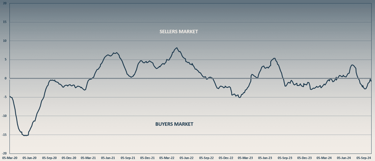 The Market Pulse has risen by 2.0 points this month and 0.1 points year-over-year. Despite these increases, the current value of -0.75 points suggests the market is relatively balanced, leaning slightly in favor of buyers.